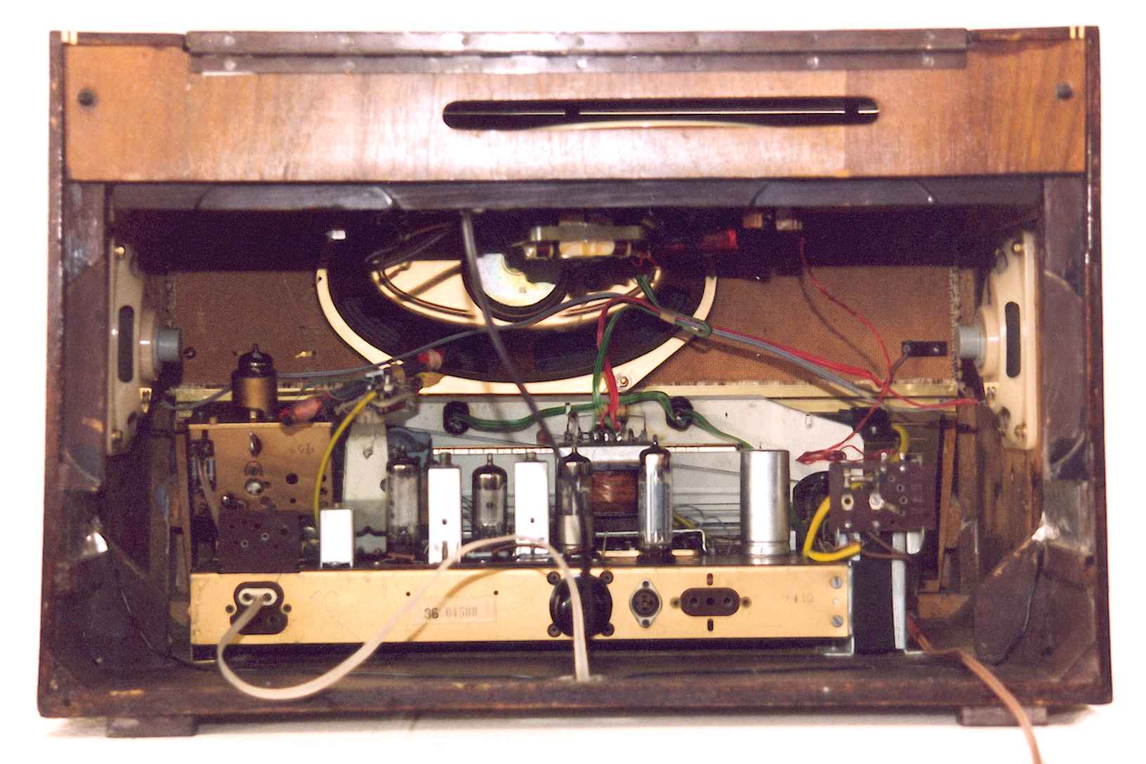 Details zur Instandsetzung Zustand nach dem Kauf Nach dem Empfang und der ersten Sichtung präsentierte sich die ganze Geschichte in einem unglaublich schlechten Zustand. Der Lack des gesamten Gehäuses war gesprungen und abgesplittert, der eingebaute Plattenspieler absolut marode, zerbrochener Tonarm, fehlende Tonabnehmer, zerflederter Gummiteller. Dazu war Alles aussen und innen mit einer dicken Fett- und Schmutzschicht überzogen. Die erste Beurteilung war: Höchstens als Ersatzteilobjekt verwendbar. Reparaturen Da mir persönlich die Form und der eingebaute Plattenspieler sehr gut gefällt, wurde ein „Rettungsversuch“ unternommen. Erste, grobe Reinigung in noch montierten Zustand, so gut es eben ging. Dann eine Sichtkontrolle mit folgendem Ergebnis Radio: Netzsicherung fehlt, Netzkabel und Stecker an sich in Ordnung, offenbar alle Teile in Originalzustand vorhanden, der 2K Widerstand auf dem Ausgangsübertrager (Speisung Anodenspannung) offensichtlich verbrannt. Ein erstmaliges, kurzes Einschalten nach Einsetzen einer korrekten Netzsicherung zeigte, dass immerhin die Skalenbeleuchtung funktionierte, das magische Band wurde hell (Anodenspannung vor dem verbrannten Widerstand) vorhanden, aber natürlich kein Ton. Nun wurde erst mal das Chassis ausgebaut und beschlossen, die Technik in Ordnung zu bringen. Der verbrannte Widerstand wurde ersetzt und nun gab es immerhin Töne von sich. Die vorgenommen Messungen zeigten: Netzspannung am Chassis, NF Kondensator im Primärkreis des Netztrafos defekt, erst mal ersatzlos entfernt. Anodenspannung vor dem Widerstand 290 V, ok., nach dem Widerstand 230 V ok, Kathodenspannung der EL84 7V ok, Gitterspannung der EL84 0V ok. Anschliessend wurde das Chassis komplett zerlegt (Tasten, Skalenscheibe, Regler) und gründlich gereinigt und wieder zusammengebaut. Der nun folgende Detailtest zeigte auf UKW keine Auffälligkeiten, in LMK allerdings war zuerst noch ein Kurzschluss vom Drehko auf den Oszillator zu beheben, nun spielten auch diese Bereiche. Allerdings waren dann noch Kratz- und Prasselgeräusche bei der Sendewahl auf allen Bereichen vorhanden. Kontaktfedern des Drehkos mussten gereinigt und die Lager neu eingestellt werden, dann war auch dies ok. Ein anschliessende Dauertest von 1 Stunde ergab dann keine Auffälligkeiten mehr. Plattenspieler: Erste Messungen ergaben einen Unterbruch in einer Wicklung des Motors, also kaum reparierbar. Zudem war keine Tonzelle vorhanden, demzufolge auch keine Nadel. Der Tonarm war an der Lagerung gebrochen (Transportschaden). Einmal erst weggestellt und auf die Suche eines zweiten Plattenspielers gegangen. Zwei Plattenspieler gleichen Typs bei eBay ersteigert. Dann konnte der defekte Motor und die Tonzelle ersetzt werde, Der Ausbruch des Tonarmes wurde geklebt und dann alles sauber verschliffen und anschliessend gespritzt. Eine neue Nadel für diesen Typ musste gesucht werde. Über Internet in Deutschland eine Firma gefunden, welche noch drei absolut neue Nadeln liefern konnte: Ein Stück Type NM (Normal- und Mikrorillen), ein Stück MM (nur für neue Platten auf beiden Einstellungen) und ein Stück M (Nur eine Nadel für Normalplatten). Dann komplette Einstellung aller beweglichen Teile und Schlusstest: Alles ok. Gehäuse: Alles wird bis auf das rohe Gehäuse ausgebaut und erst einmal abgelaugt und grob geschliffen. Das Resultat: Es besteht Hoffnung, eine komplette Neulackierung muss allerdings gemacht werden. Die Lackierung dauerte Monate: Hartgrund lackieren, schleifen und anschliessend sechsmal von Hand lackiert, geschliffen und poliert. Nach dem zweiten Anstricht wurden die Goldfilets aufgebracht (2mm Streifen bei einer Bilderrahmenwerkstatt gefunden). Am 23. Oktober 2004 waren alle Arbeiten abgeschlossen, Alles funktionierte prima. Nach einem vierstündigen Dauertest ohne Probleme wurde das Radio im Wohnzimmer installiert und ist seither täglich in Betrieb.